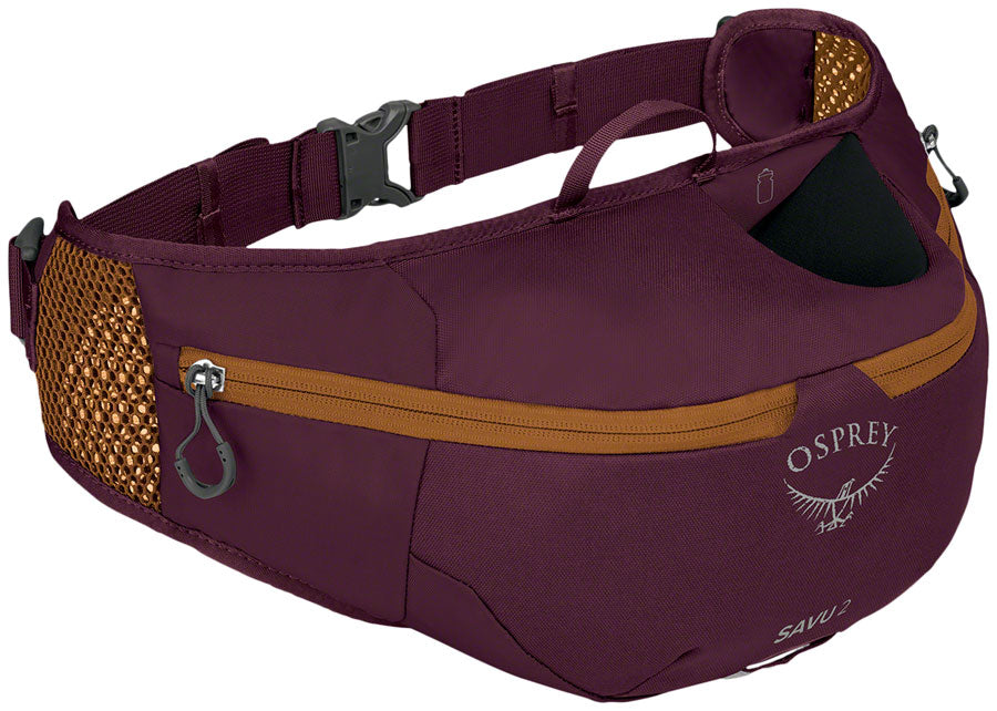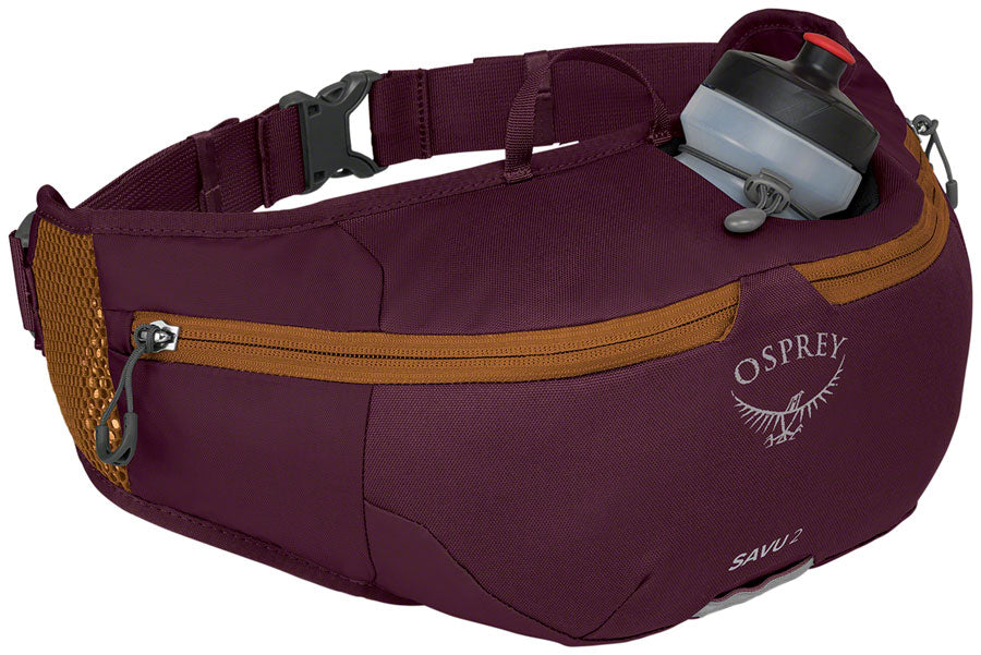 Osprey Savu 2 Lumbar Pack - One Size Aprium Purple. Savu 2 Lumbar Pack. Reach for this single-bottle lumbar pack for quick laps on your favorite trails. Offering enough storage capacity for ride essentials such as a spare tube CO2 multi-tool and snacks. Constructed with high-quality bluesign®-approved recycled high-tenacity nylon with a PFC-free DWR coating.