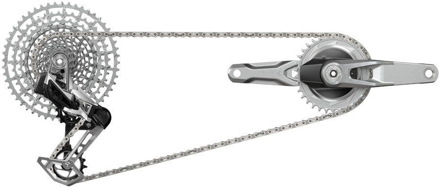 The SRAM limited edition '1987' T-type Eagle Transmission Power Meter groupset features a combination of T-Type Ecosystem components of which SRAM is most proud, all in an exclusive silver finish. The Eagle Transmission 1987 Collection takes the most advanced aluminum crankset they’ve ever made, and pairs it with SRAM's most high-performing and most accurate powermeter. While the cassette’s architecture is rooted in the design of their lightest weight MTB cassette, XX SL, they were able to shave off an additional 25 grams from it without sacrificing performance or durability. Same 12-Speed 10-52t range, same renowned best shift under load quality. The 1987 Collection T-Type chain features hollow links, hollow pins, and a Hard Chrome coating pushing the strength-to-weight ratio to an unprecedented level. Unrivaled shifting performance, unprecedented strength. The 1987 Eagle Transmission derailleur features AXS connectivity, the radical Full Mount, and a limited silver colourway. Two AXS Pod Ultimate Controllers complete the kit, giving you an organized cockpit and the freedom of left and right-hand customization. This is the 1987 Collection. The dream delivered.