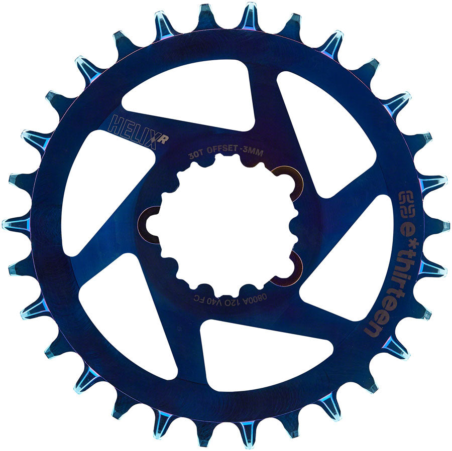 e*thirteen Helix R Guidering - 30t 11/12-Speed 3mm Offset SRAM 3-Bolt DM Intergalactic. Helix R SRAM Direct Mount Chainrings offer a true upgrade solution for SRAM 3-Bolt MTB crank users (including DUB) to achieve cross compatibility with both SRAM™ and Shimano™ 11 and 12-speed drivetrains.Forged from 7075- T7 aluminum then extensively CNC optimized for industry leading weights and a unique high-end full CNC aesthetic