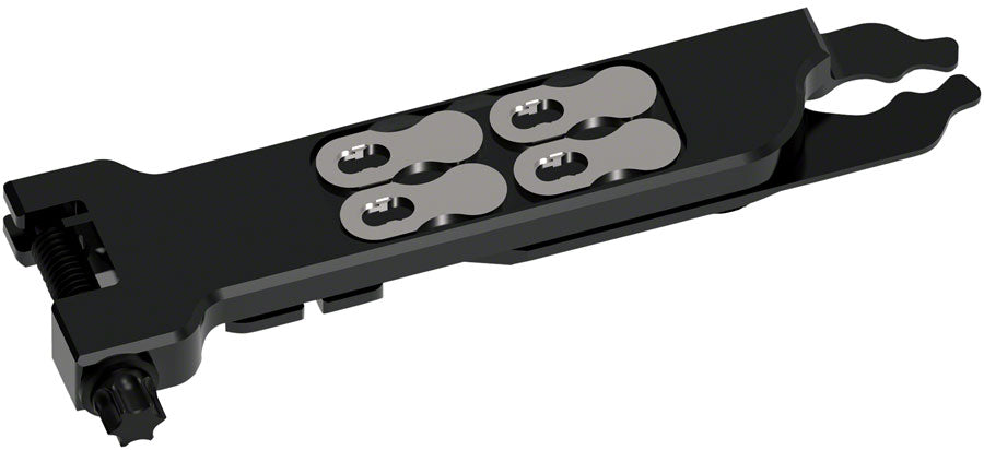 Lezyne Chain Pliers Multi Tool Black. Professional grade versatile bike chain multi tool engineered for a variety of road or trailside repairs. The Multi Chain Pliers are constructed from machined aluminum and feature an integrated quick-link tool chain breaker valve core tool bottle opener rotor aligner and magnetic holders for up to two spare quick links. Its slim design allows for maximum portability and it’s engineered for long-lasting use. It also features an anodized finish and a hardened steel chain breaker pin. Mountain bikers road cyclists and gravel grinders will all find its versatility highly useful whether in the workshop or out on the road or trail.