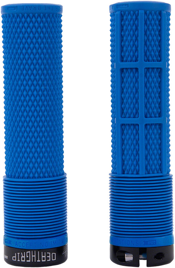 DMR DeathGrip Flangeless Grips - Thin Lock-On Royal Blue. The DeathGrip Flangeless is the second collaboration between DMR and Brendog. DMR started with an internally tapered single-lock core grip and wrapped Brendan's design around it in super-soft Kraton compound.Flangeless grip with Soft single Krayton rubber