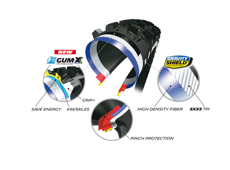Michelin E-Wild Tire - 29 x 2.6 Tubeless Folding Gum-X Black Rear Ebike. E-Wild rear tire with optimal grip in mind. Lateral and central rubbers transmit the bike's full power and optimise motricity even on climbs.Pinch Protection technology which absorbs the energy from pinch flats