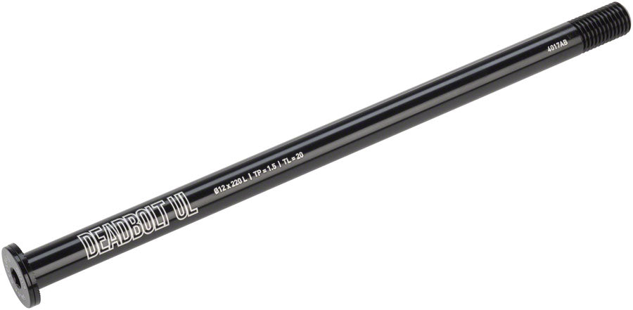 Salsa Deadbolt Ultralight Thru-Axle Rear 12mm Axle Diameter 220mm Length 1.5 Thread Pitch 20mm Thread Length. The Deadbolt Ultralight Thru-Axles are offered in a 6mm flat button head design for a flush clean look. Lightweight easy to use and secure.
