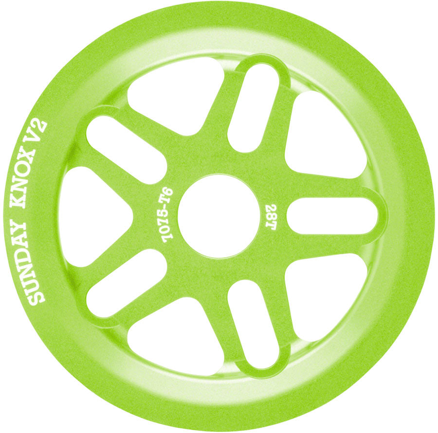 Sunday Knox V2 Sprocket - 28t Electro Green. The Sunday Knox V2 guard sprocket made of 7075-T6 aluminum. Featuring refined machining geometry for a sleeker look and designed to work with and protect all chains from unwanted impact.Full guard on one side of the sprocket with 5 rotatable sprocket bolt hole positions