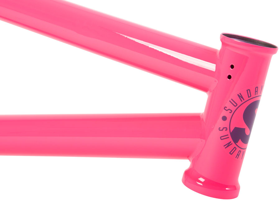 Sunday Street Sweeper BMX Frame - 20.5" TT Hot Pink. Jake Seeley's signature frame is designed to complement his progressive technical street riding. The Street Sweeper evolves directly from Jake Seeley's original Broadcaster frame by using shorter chain stays a steeper head tube angle a taller bottom bracket and smaller hollow dropouts with integrated chain tensioners. Built with versatility in mind the Street Sweeper features removable u-brake hardware and Gyro tabs. The frame's front triangle makes use of traditional round Nightshift style top and down tubes with proven internal gusseting.100% 4130 Chromoly Frame