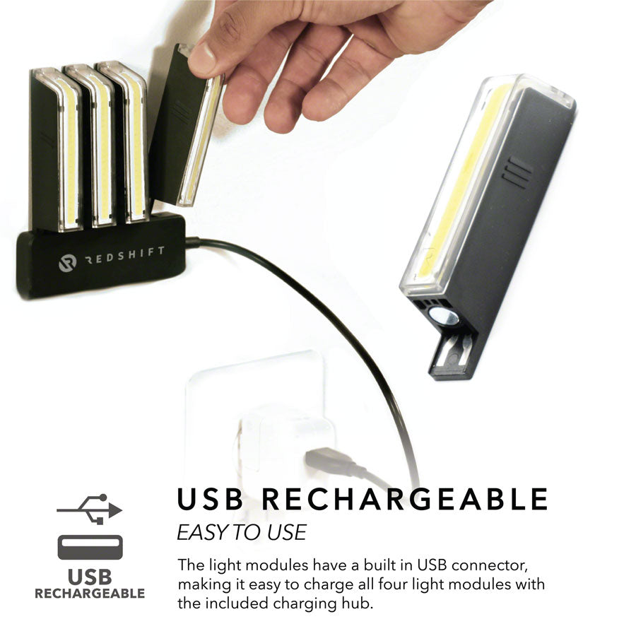 • The Light Modules have a built-in USB plug for easy charging on any standard USB charger or with the included 4-place charging hub